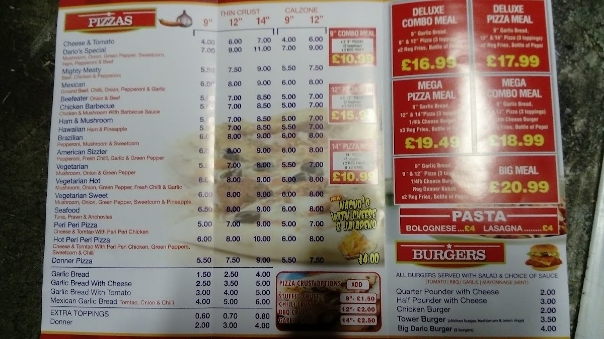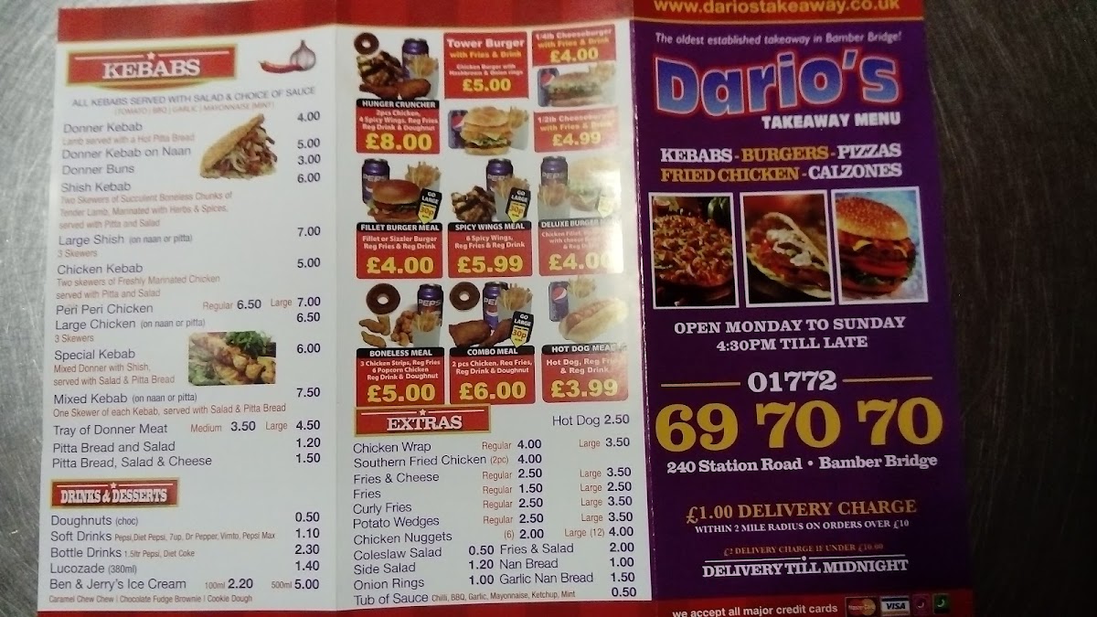 Welcome to Dario's, your go-to destination for mouthwatering takeaway delights in Bamber Bridge! Nestled at 240 Station Rd, our menu boasts a range of tantalizing dishes, perfect for any craving. Dive into our delectable burger selections, featuring the Tower Burger and the Big Dario Burger, ideal for those looking to indulge. For a lighter option, try our spicy wings or the classic 1/4 Pounder — each meal comes complete with fries and a drink, making it a fantastic deal.